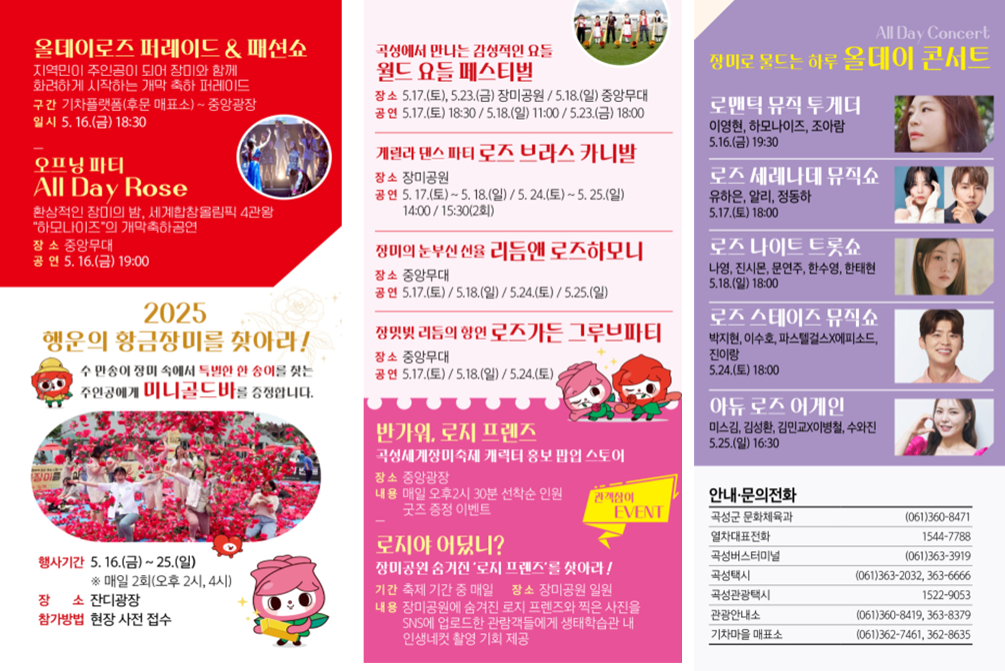 곡성세계장미축제는 봄을 대표하는 꽃 축제 중 하나로, 남도 여행과 함께 묶어 즐기기에도 최적입니다. 매년 새로운 테마와 공연이 추가되어 매번 달라지는 즐거움도 이 축제의 큰 매력 중 하나입니다.