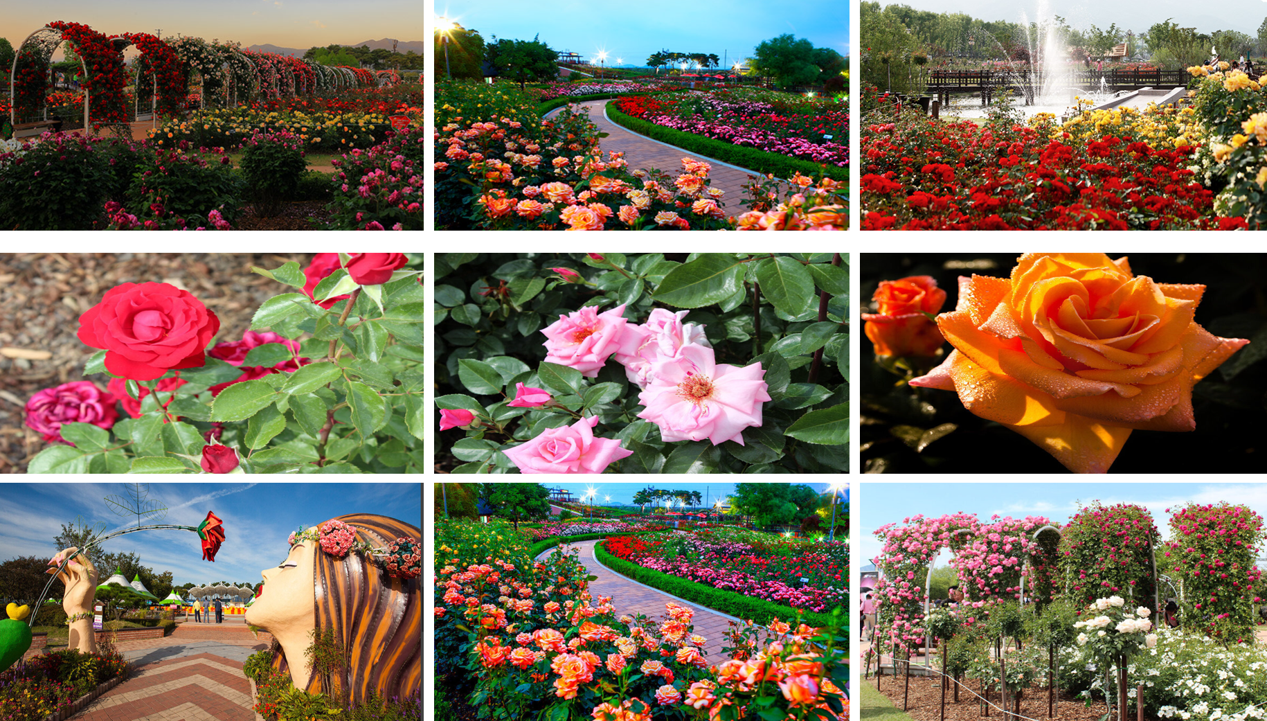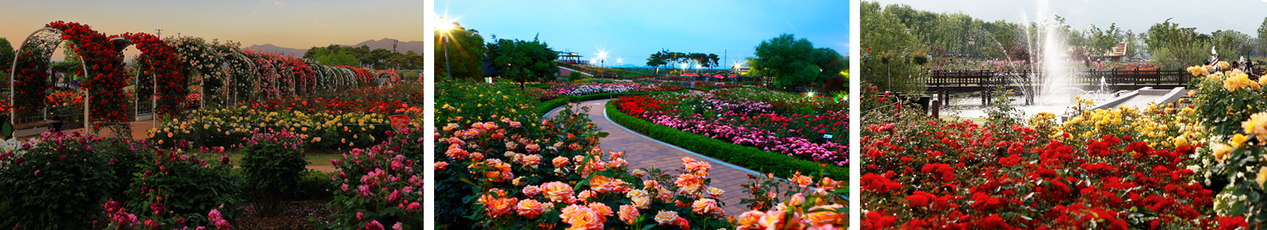 1,000종이 넘는 세계 장미 품종이 테마별로 구역을 나눠 전시됩니다. 유럽풍 정원, 프랑스 장미길, 영국식 로즈터널 등 포토존으로 인기가 많습니다.