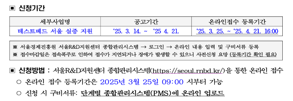 - 테스트베드 서울 공식 홈페이지를 통해 공고 확인 후 온라인 접수