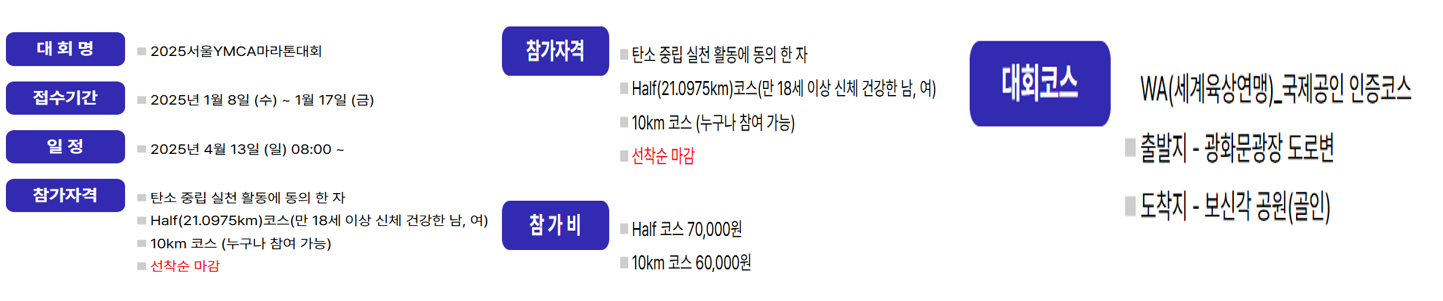 올해도 건강과 나눔을 실천할 수 있는 뜻깊은 마라톤 대회가 찾아옵니다. 서울에서 개최되는 YMCA 마라톤은 남녀노소 누구나 함께 즐길 수 있는 열린 러닝 행사예요. 아래에서 일정과 주요 정보를 간단하게 확인해보세요!