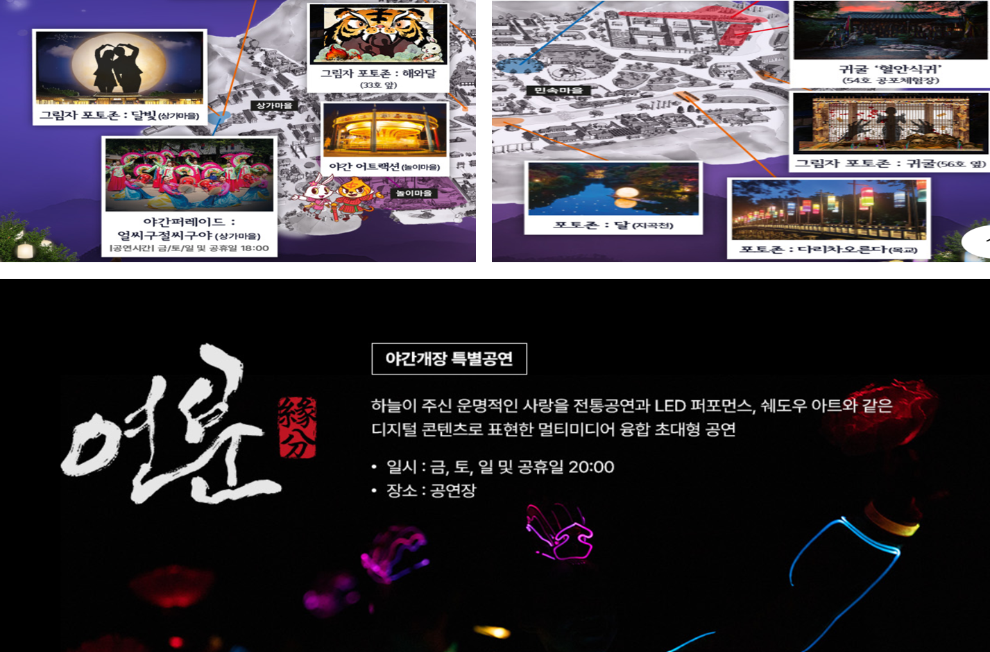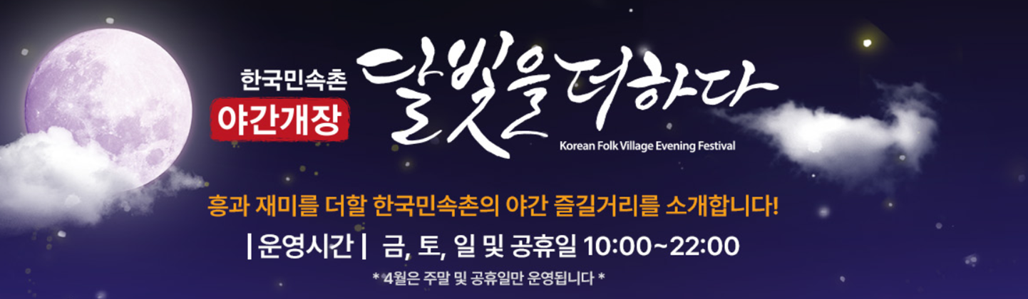 낮 동안의 전통 문화 체험은 물론, 어둠이 내린 후 펼쳐지는 전통 조명과 야경, 공포 체험, 테마 축제 등으로 남녀노소 모두에게 색다른 추억을 선사하는 곳이 바로 한국민속촌 야간개장입니다.