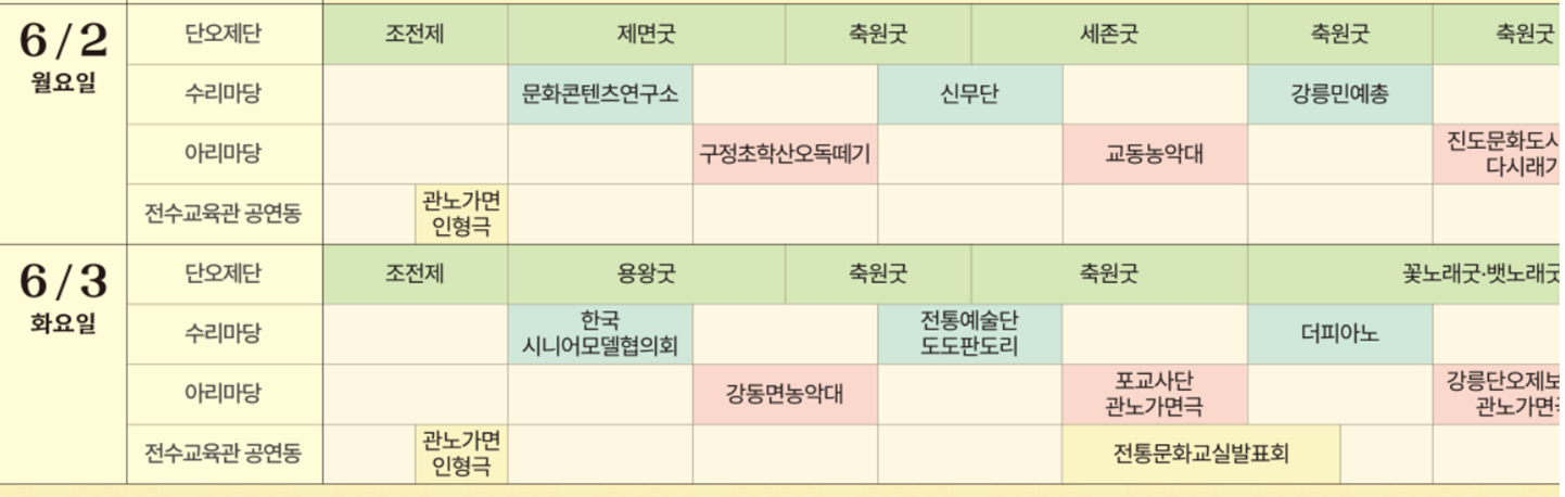 - 단오굿 및 주요 공연은 인파 많으므로 30분 전 도착 필수