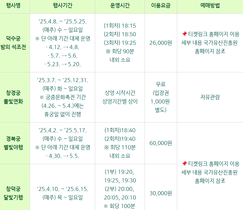 - 예매처: ‘조선왕궁 홈페이지’, ‘인터파크’, ‘11번가 티켓’ 등