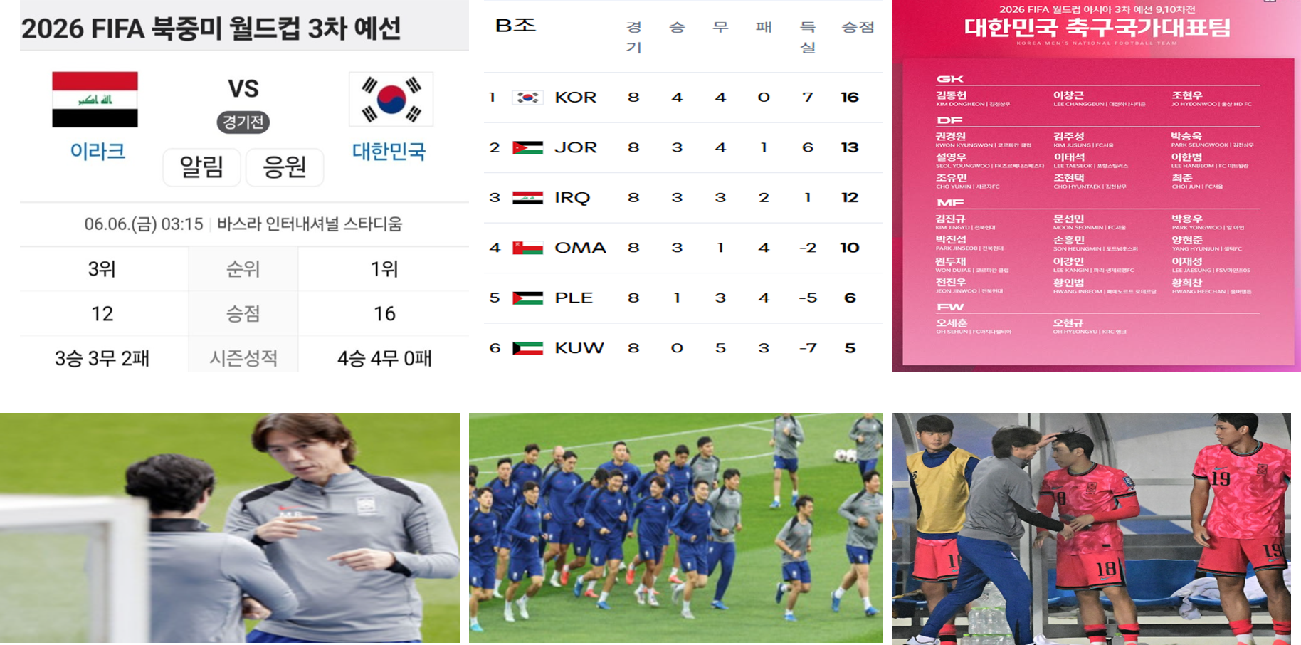 2026년 북중미 월드컵 아시아 지역 3차 예선이 본격적으로 진행 중입니다. 이번 3차전은 대한민국 대표팀이 이라크를 바스라 인터네셔널 스타디오 경기장에서 상대로 중독 에서 치르는 원정경기로, 본선 진출을 위한 매우 중요한 경기입니다.